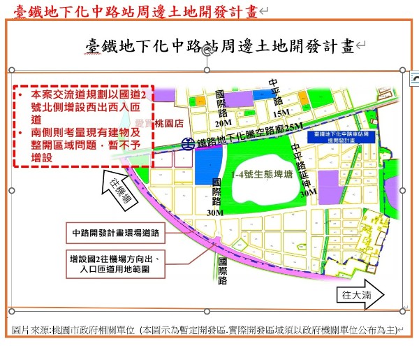 本計畫開發範圍緊鄰桃園都會核心發展區,周邊發展密集,開放空間不足,範圍內國際路及玉山街為地區重要幹道,長期面臨交通擁塞窘境,爰配合桃園鐵路地下化建設計畫新增中路車站之都市發展契機,檢討變更車站周邊農業區,提供桃園都會長期發展住商用地,併同規劃大型開放空間,完善地區性交通路網系統,以滿足都會生活需求。